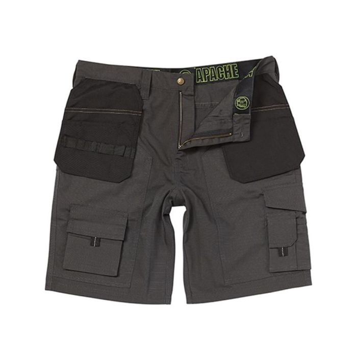 Durable and lightweight grey/black work shorts designed for maximum comfort in warm weather. Features Cordura® holster pockets, elasticated waist, multiple storage compartments, and a YKK zip for lasting reliability — perfect for trade professionals.