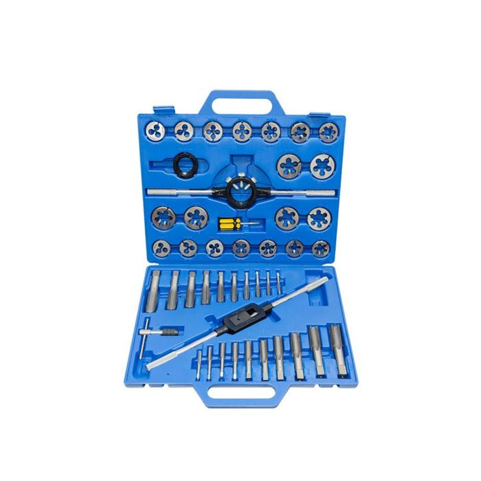 To enhance accuracy, the set features split dies, allowing fine adjustment of the core diameter. This gives greater control when cutting threads and helps achieve a precise fit, especially when working with worn or sensitive materials. The taps and dies are complemented by a sliding jaw tap wrench, a T-bar type tap wrench, and a steel die holder with knurled screws, providing secure grip and smooth operation during use.