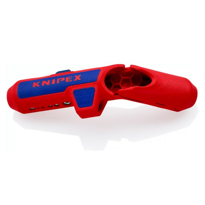What makes the ErgoStrip stand out is its innovative ergonomic pistol grip design. KNIPEX developed it to make cutting, stripping, and longitudinal sheath cutting feel more controlled and natural in the hand. In practice, that means better guidance, less awkward wrist positioning, and smoother handling during repetitive work. The conical, slimmed-down tool ends also improve access in confined areas such as sockets and boxes, where bulkier stripping tools can become frustrating to use.