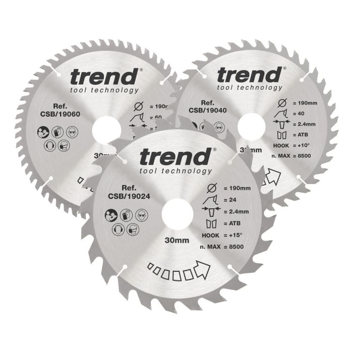 With a 190mm diameter, 30mm bore, 2.4mm kerf in the supplied product text, 24/40/60 tooth configuration, ATB tooth form, 15° hook angle, and a maximum speed of 9000rpm, the CSB/190/3PK is a strong all-round blade set for users who want more than a single compromise blade in the toolbox. Trend also lists compatibility with selected Bosch, DeWalt, Einhell, HiKOKI, Makita, and Metabo saws, including Bosch Pro GKS 190, DeWalt DWE575 and DWE576, Makita HS7601 and HS7611, and Metabo KS 66 FS.