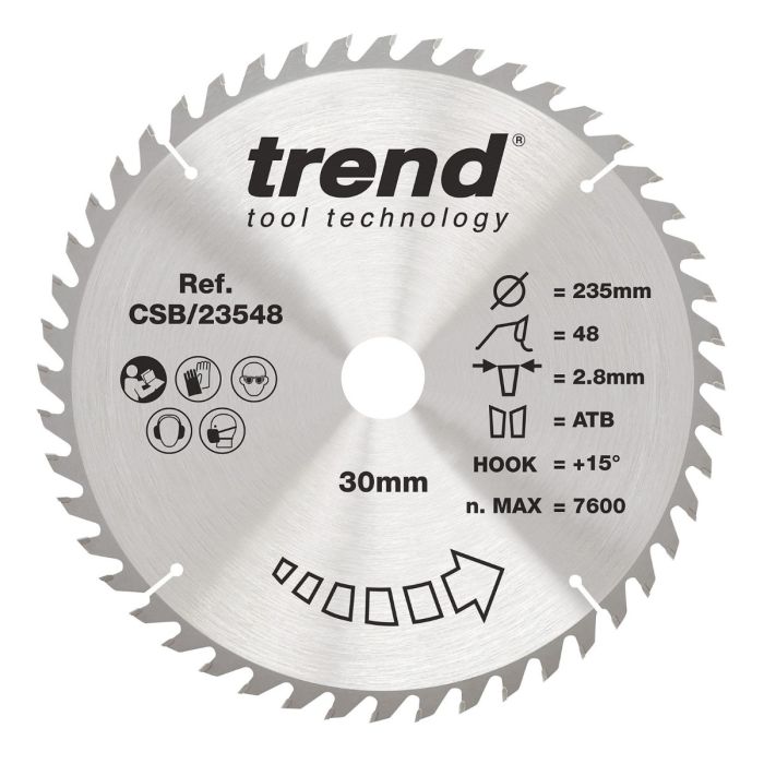 Built for clean, confident crosscutting in wood and wood-based sheet materials, the Trend CSB/23548 is the blade you fit when you want a smoother finish without sacrificing control. Designed for circular, plunge, and table saws, this 235mm x 30mm blade uses a 48 tooth ATB tooth form and 15° hook angle to deliver fine cutting performance in softwood, hardwood, plywood, MDF, and hardboard. Microgranular tungsten carbide tips help maintain sharpness over repeated use, while the precision-ground alloy steel plate, hardened body, and expansion slots work together to reduce vibration, maintain accuracy, and support a steadier cut from start to finish. Trend’s live product page lists it as a fine-finish crosscut blade with a 2.8mm kerf and 1.8mm plate thickness.