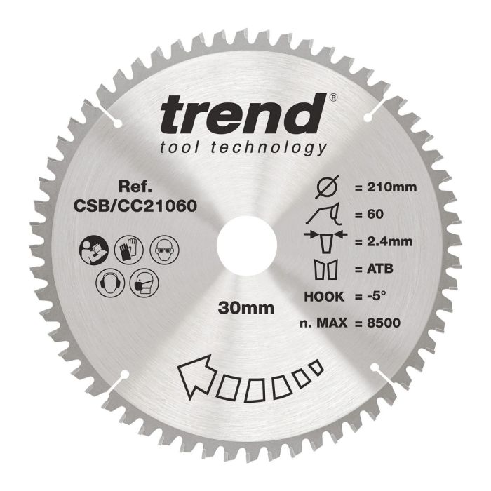 The Trend CSB/CC21060 Wood Mitre Saw Blade 210mm x 30mm x 60T is built for the kind of work where a clean edge is part of the finished result. When you are cutting skirting boards, architraves, floorboards, window boards, cladding, or decking, a rough cut can slow the whole job down. This blade is designed to help every pass feel more controlled, more accurate, and better suited to finish work, making it a dependable choice for mitre and radial arm saw users who need consistent crosscutting performance in wood and wood-based materials. Trend positions it specifically for cross-cutting applications rather than general-purpose ripping.