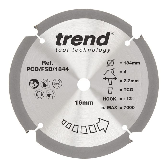 For product setup, the current listing for PCD/FSB/1844 shows an 184mm diameter, 16mm bore, 2.2mm kerf, 1.6mm plate thickness, 4 teeth, TCG tooth form, 12° hook angle, and coarse finish. One important detail: the product title on some Trend pages still says 184mm x 20mm x 4T, but the specification block and multiple matching seller listings show the bore as 16mm, so there appears to be a naming inconsistency on the title line.