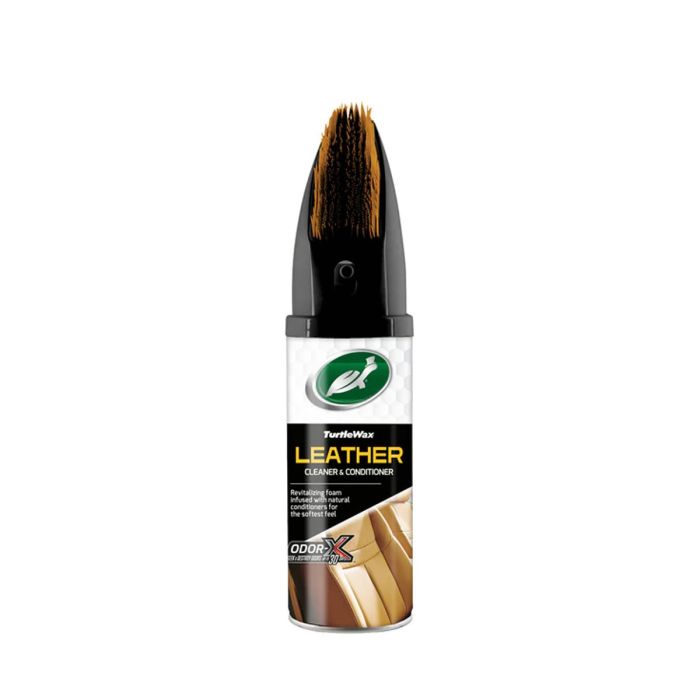 Turtle Wax Power Out Leather Cleaner (400ml) with integrated soft-bristle brush cleans, conditions, and protects leather upholstery. Foam formula with Odor-X® technology removes stains, eliminates odours, and restores a natural satin finish.