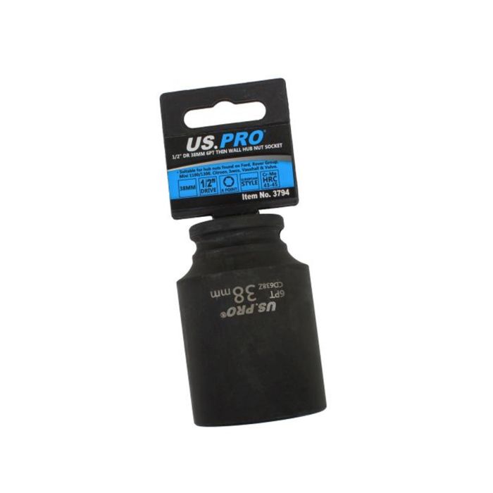 The US PRO 3794 38mm thin wall hub nut socket is engineered for working in restricted access areas where standard sockets are too thick. Its thin wall Euro-style profile allows access to recessed hub nuts while maintaining the strength required for high-torque impact applications.