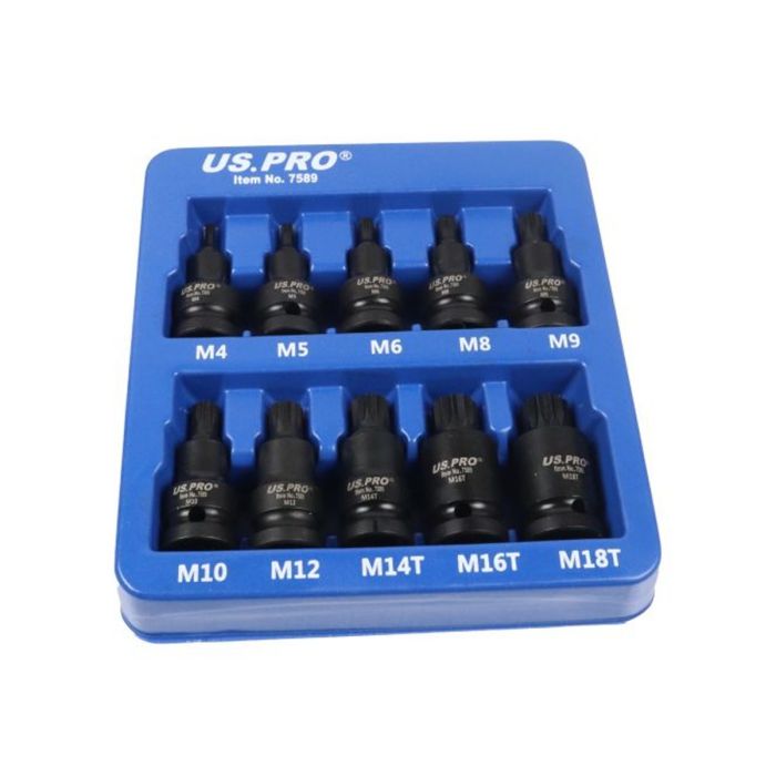 US PRO 7589 10pc 1/2" Drive Impact Spline Bit Socket Set (M4–M18 Tamper-Resistant)