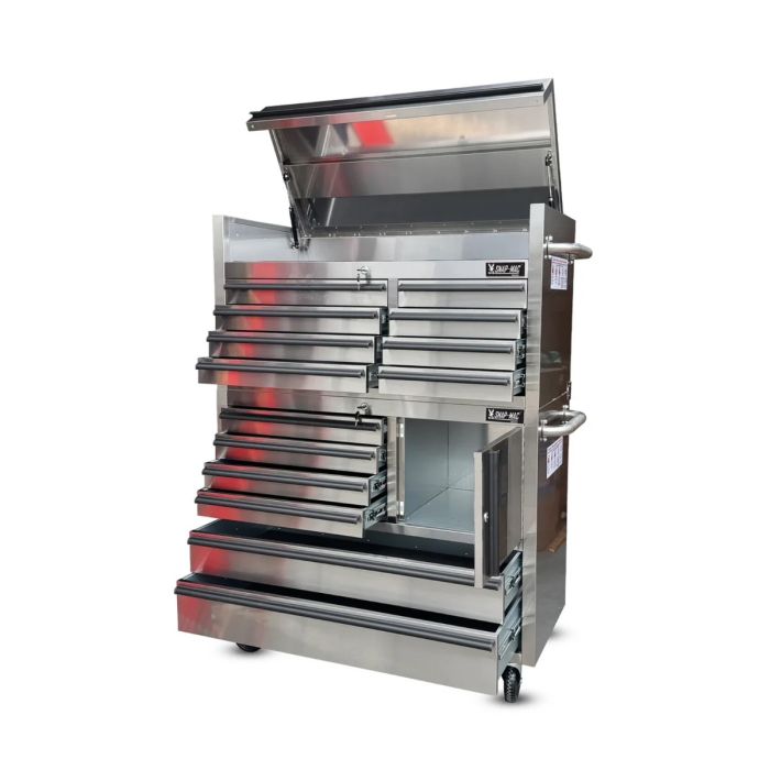 The US SNAP MAC 41" Stainless Steel 14 Drawer Roller Tool Cabinet is built for workshops that demand strength, structure, and serious storage capacity. Constructed from 430-grade stainless steel with a brushed 20-gauge finish, this cabinet is engineered to handle the demands of professional garages and fabrication environments while maintaining a clean, modern appearance.