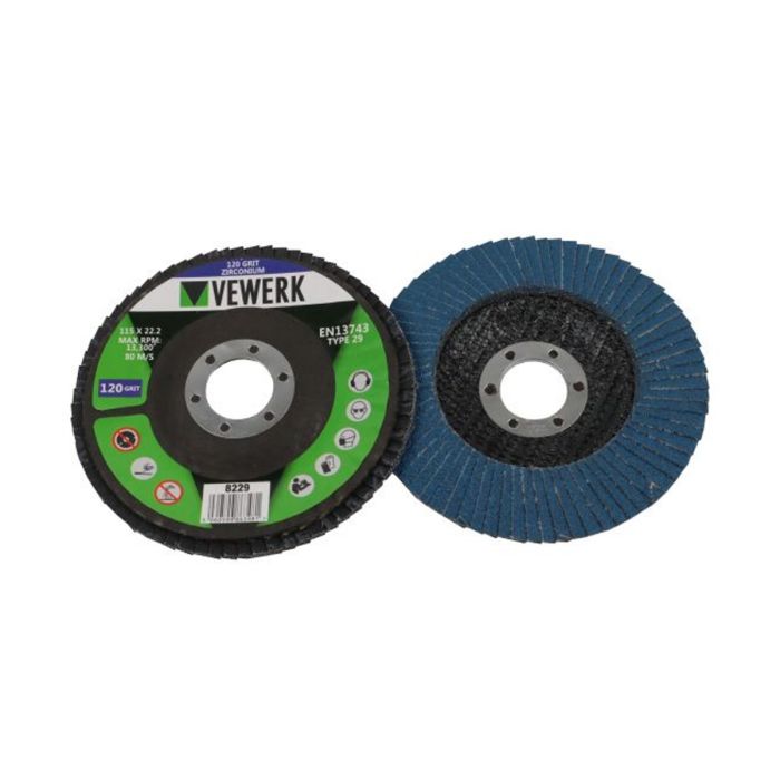 VEWERK 8229 Zirconium Flap Discs 120 Grit Type 29 – 115 × 22.2mm